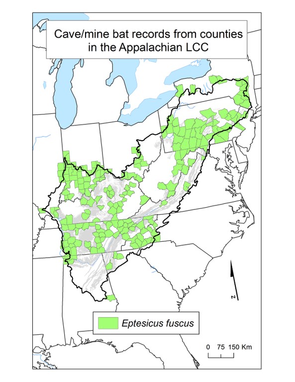 The utilization of caves by bats is quite different from other cave dwelling species. No bat spends its entire life in a cave, and during the summer, those species that roost leave at night to forage for food, primarily insects. Some species also hibernate in caves, and overall there is a varying degree of dependency on caves as a physical habitat. Many species are also found in mines, because some mines and caves are very similar habitats to bats. In the study area, there are ten species of bats that depend on caves and mines. This folder contains maps of the county scale distribution of bat species (a total of 10) which were considered.