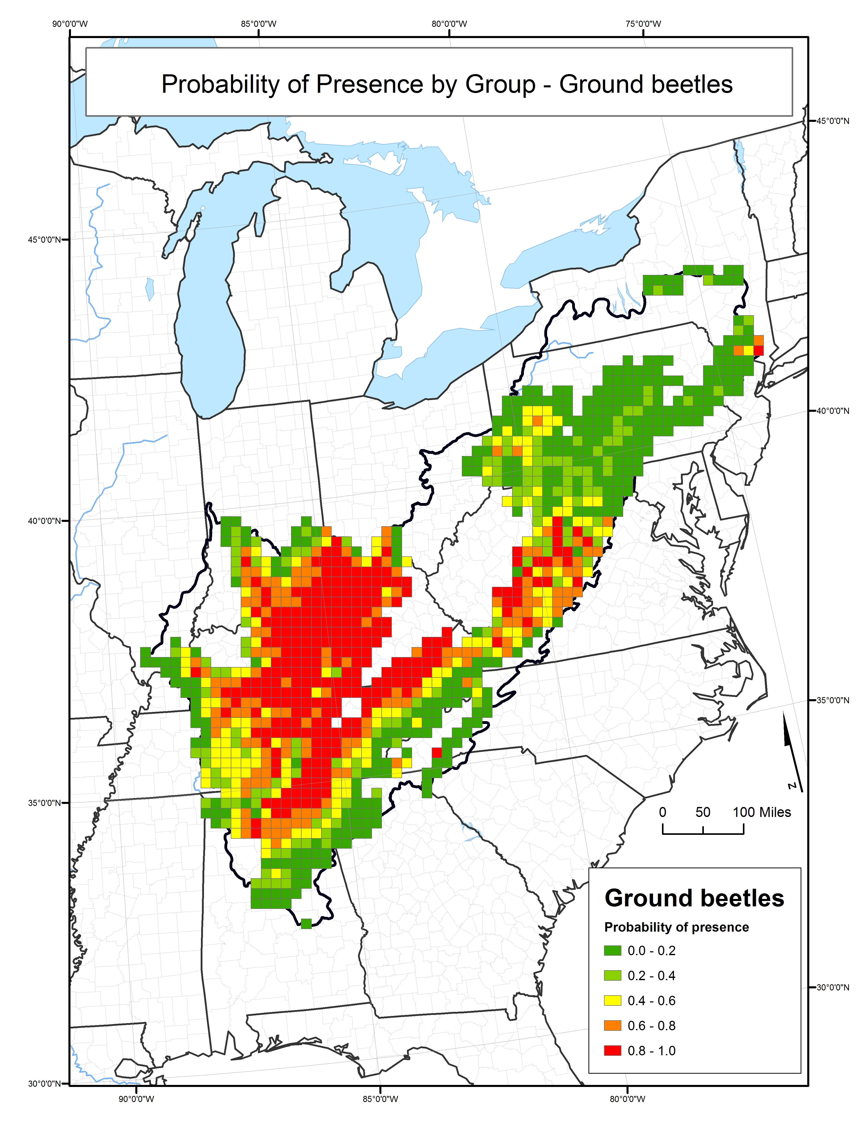 This map depicts the probability of presence for species within the ground beetle group throughout the Appalachian LCC region. Red areas have the highest probability of presence.