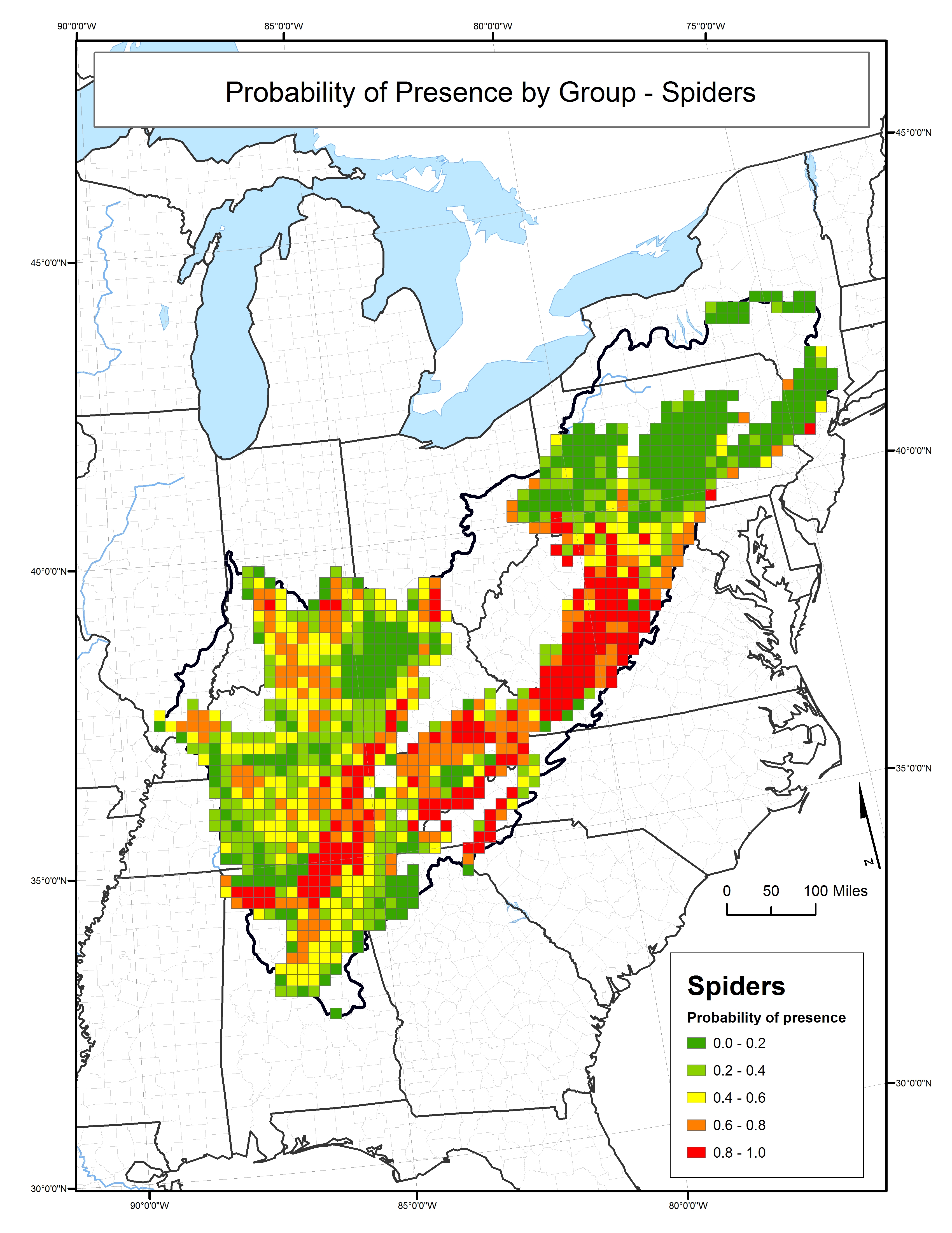 This map depicts the probability of presence for species within the spider group throughout the Appalachian LCC region. Red areas have the highest probability of presence.