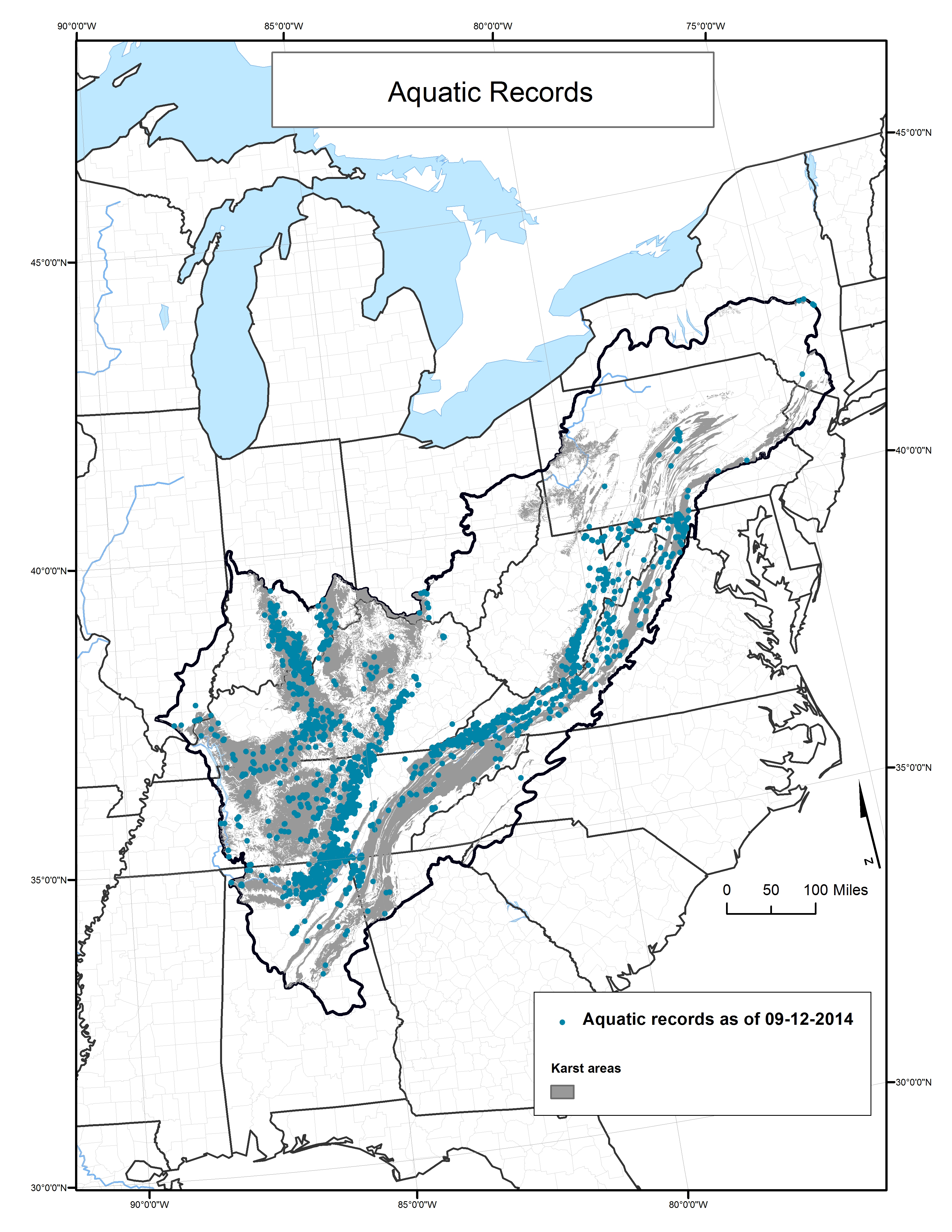 The karst map provides the basic template for analyzing the distribution of cave species. Almost without exception, all caves occur within the karst areas. There were a few records of cave-dwelling species from outside karst areas (mostly springs) but the data was trimmed to fit within the karst areas, with a 1 km buffer to allow for errors in georeferencing). This map displays the aquatic records within karst areas in the Appalachian region.