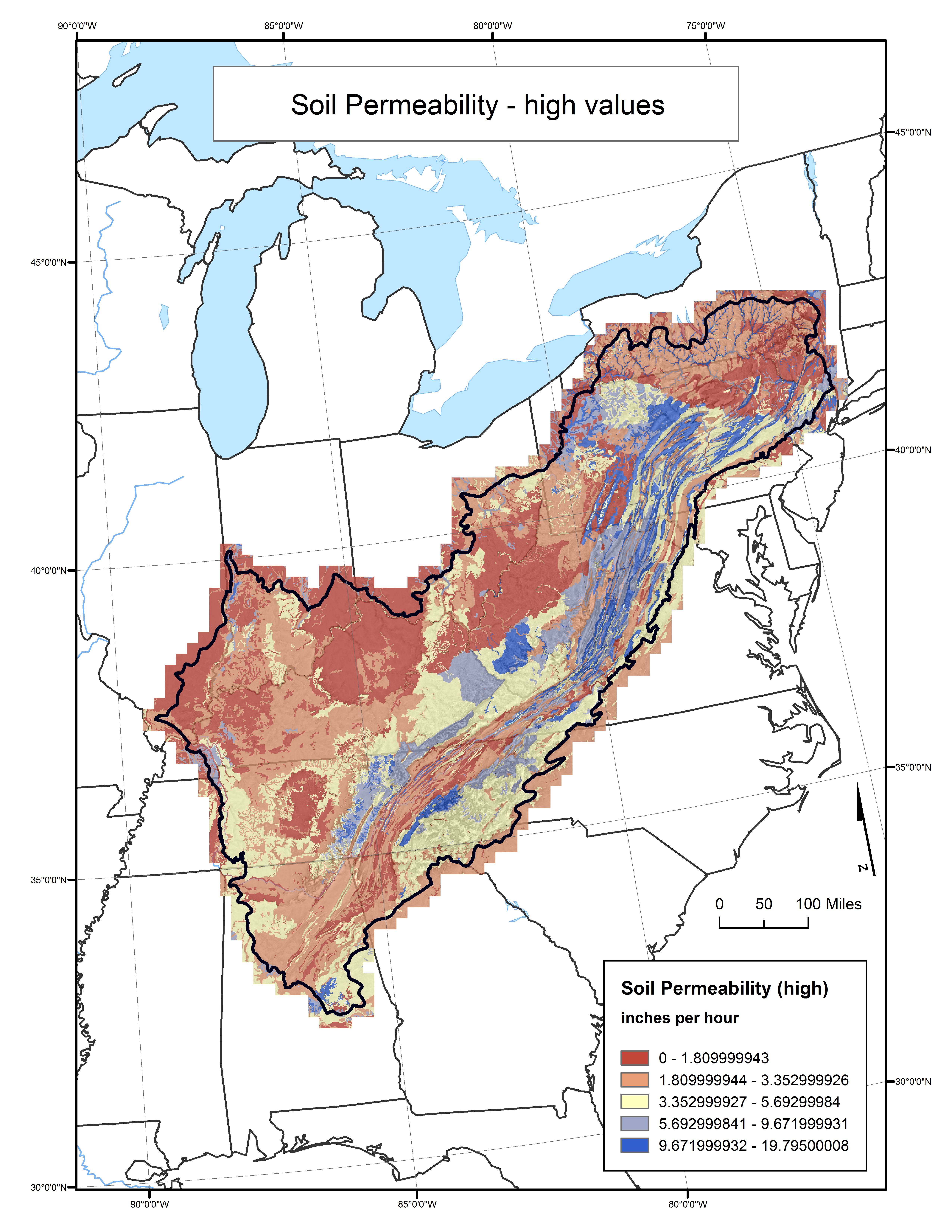 High values for soil permeability at 1 kilometer resolution throughout the Appalachian LCC region.