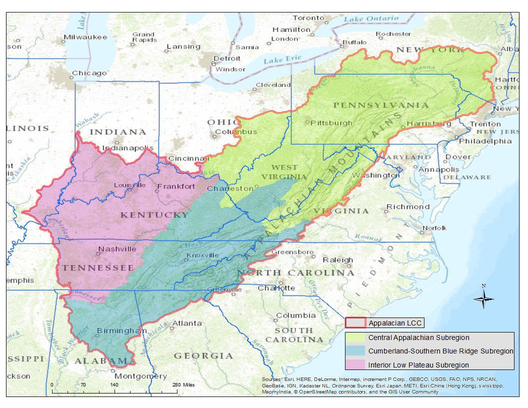 Division of the Appalachian LCC into ecologically consistent subregions used for climate change vulnerability assessments