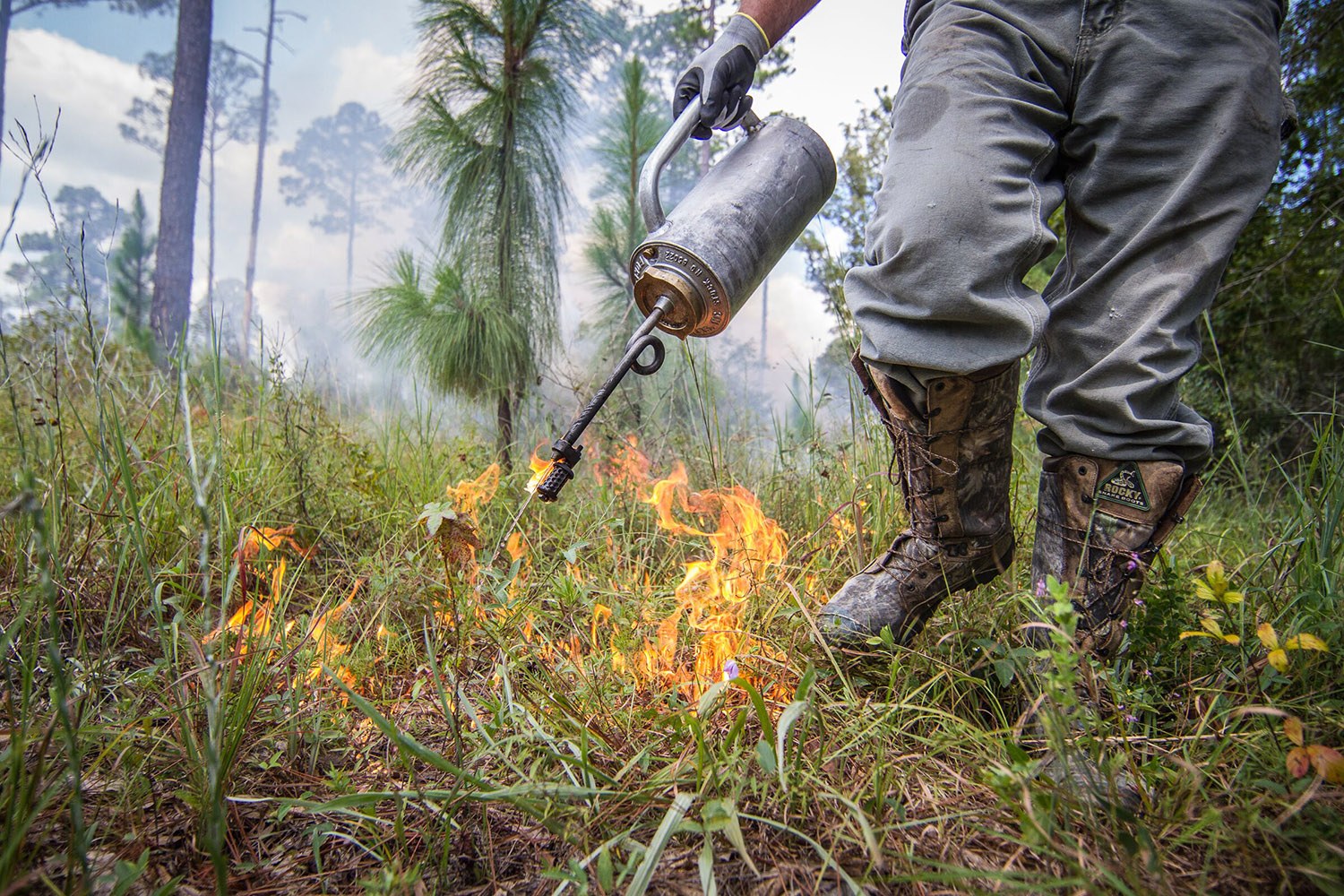 Close-up of firefighter's boots and drip torch. From Outdoor Alabama. Photo by Billy Pope, ADCNR