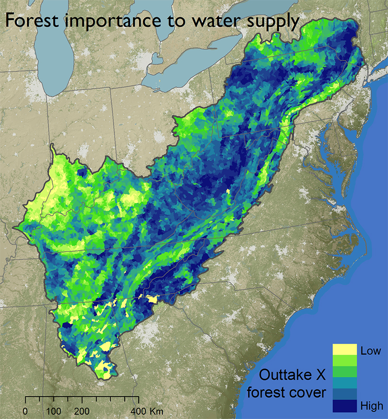 The US Forest Service’s Forests to Faucets Project represents one approach to ecosystem service assessment. Watersheds are ranked in terms of both forest cover and the estimated number of people who rely on them for drinking water. This highlights the water filtration services that forests provide in different landscapes.