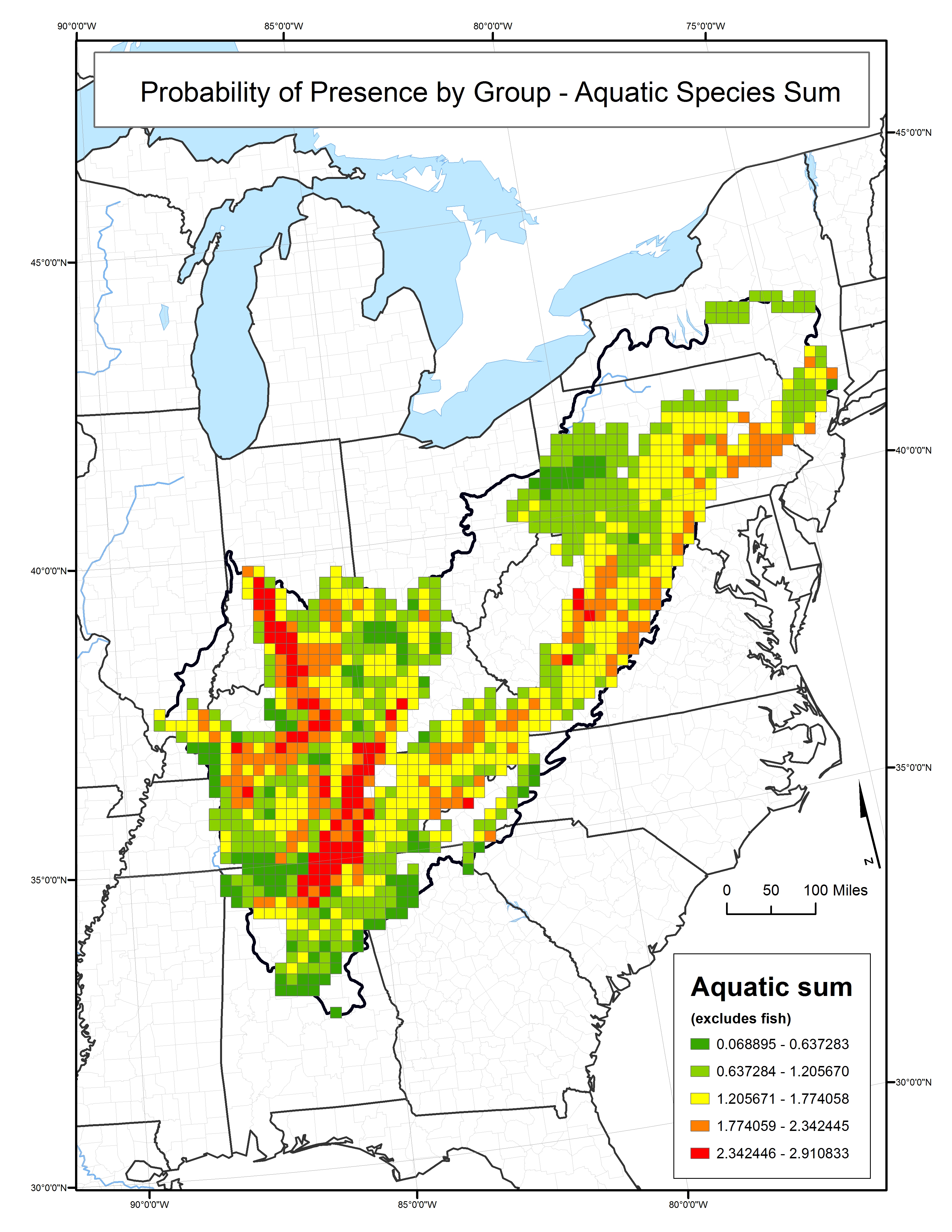 As a first step toward a predictive model of hotspots of species richness based on the predictive variables outlined above, the probabilities of each group within each grid cell were summed (excluding fish which do not occur at all in the Central Appalachians, making predictions impossible). The probabilities were summed to indicate locations that have one or more of the species groupings. Higher values indicate that more species are likely to be found.