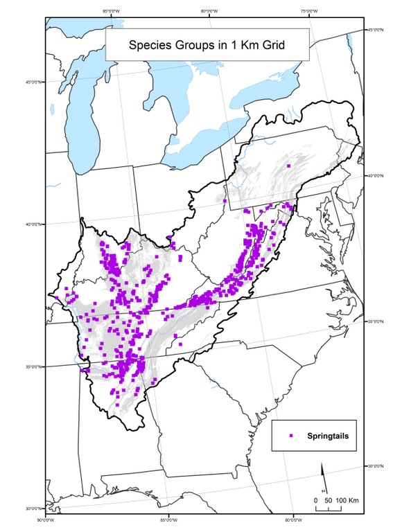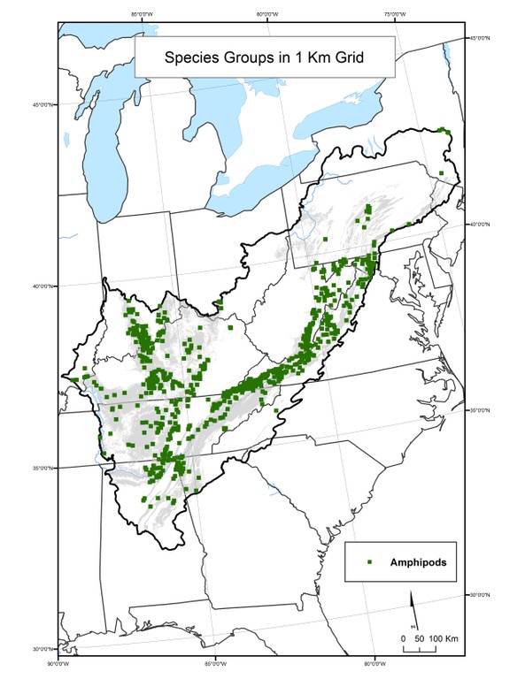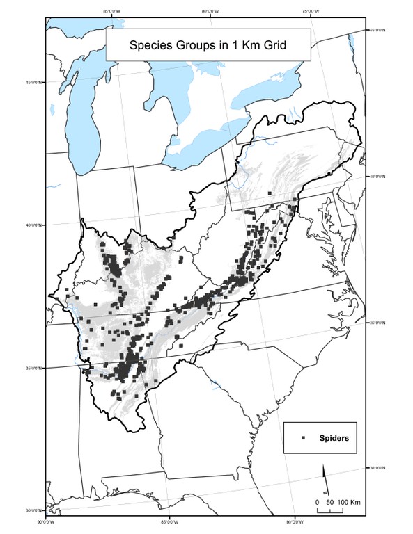Since there were too many species (710) or even genera (131) to analyze within the scope of this project, a functional ecological approach was utilized. The ranges of nine ecological groups were analyzed, including; predaceous ground beetles, millipedes, pseudoscorpions, springtails, spiders, amphipods, isopods (Asellidae), crayfish, and fish. Collectively, they are the best studied and most abundant stygobionts and troglobionts. Species within each group have very similar ecological roles, so interesting generalities should emerge about the conditions under which they are found. The number of species in each group ranges from 164 (beetles) to four (fish).
