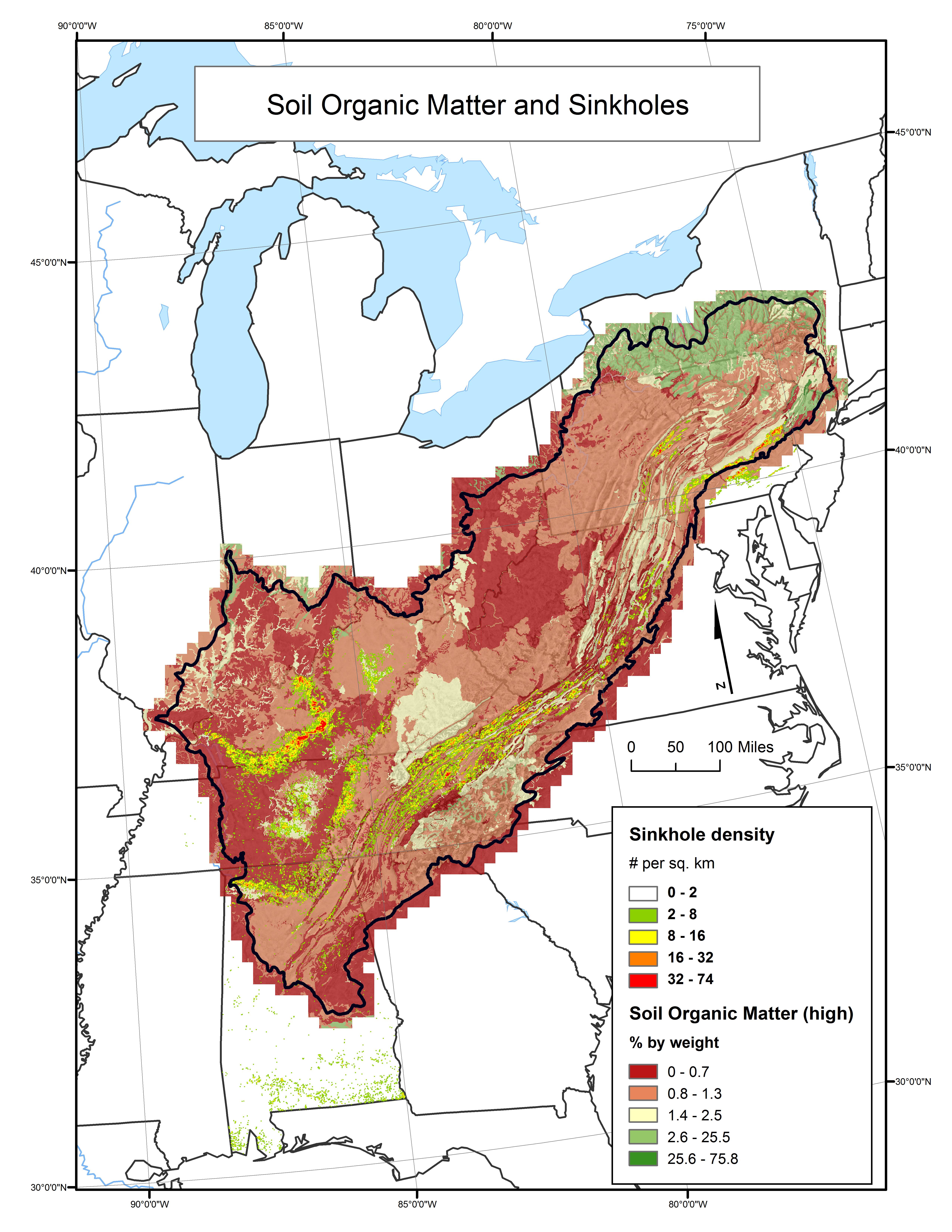 Sinkhole density (number per square kilometer) and soil organic matter (percent by weight) throughout the Appalachian LCC region.